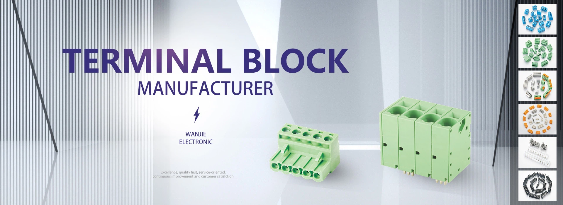 CIXI WANJIE ELECTRONIC CO., LTD je osnovan 1992., mi smo profesionalni proizvođač koji je specijaliziran za istraživanje i razvoj, dizajn, obradu, proizvodnju, prodaju i servis terminalnih blokova. Proizvodi uključuju PCB vijke i opruge, priključne, MCS, prolazne i barijerne terminalne blokove, koji se naširoko koriste u kontroli električne energije, automatizaciji, dizalima, instrumentima, komunikacijama, napajanju, sigurnosti, rasvjeti, željezničkom prijevozu i drugim srodnim područjima .